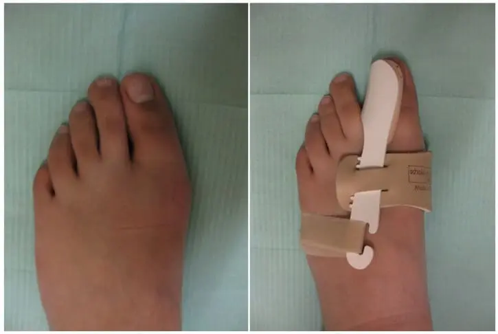 Premièrement, il faut adapter les chaussures afin de limiter le frottement. Dans ce but, on peut opter pour des chaussures plates à bouts larges et souples. Les semelles orthopédiques de par elles-mêmes, peuvent éventuellement améliorer un problème associé de l’arrière- pied ou une métatarsalgie mais quoi qu’il en soit, le gros orteil aura moins de place pour se loger. Les attelles de nuit sont utiles chez l’enfant ou l’adolescent en croissance. Ensuite, son efficacité n’est pas démontrée.