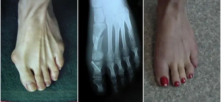 Le terme « hallux » fait référence au « gros orteil ». Dès que le gros orteil s’écarte de sa position axée vers le petit orteil, on parle d’une déformation en «valgus», d’où l’appellation habituelle d’hallux valgus. De part cela, il se développe inévitablement une tuméfaction osseuse à la partie interne du pied, appelée communément « bunion ou oignon ».