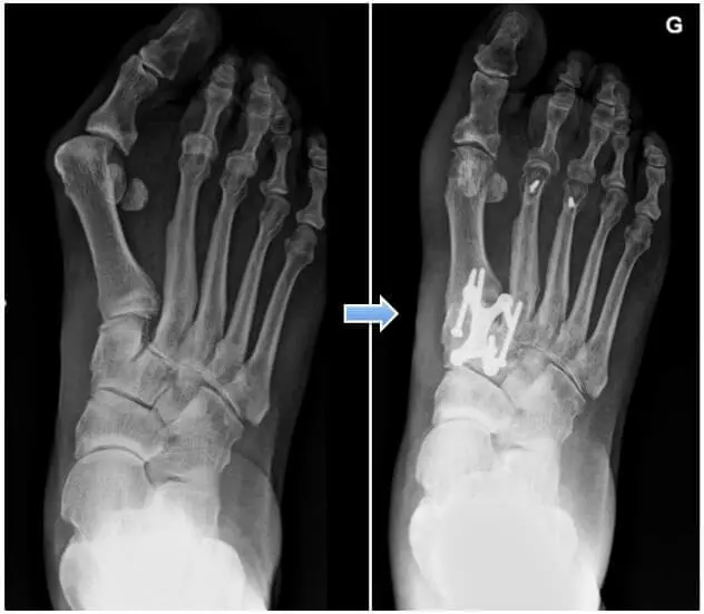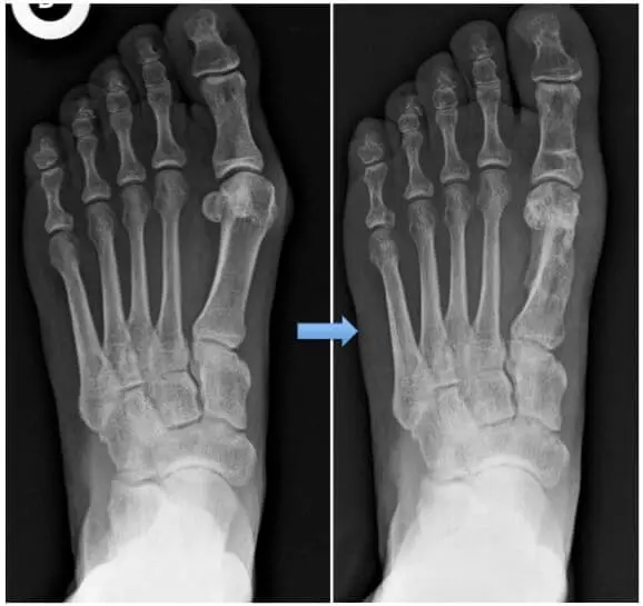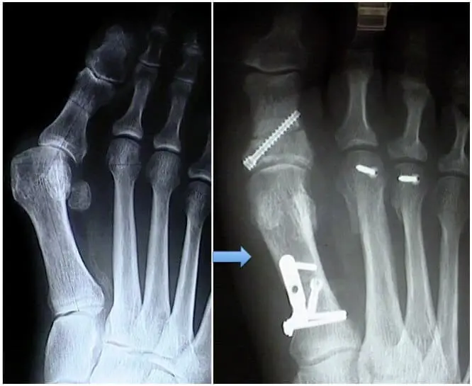 Souvent, cette correction bénéficie également d’une ostéotomie de la première phalange (Akin).